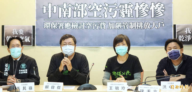 地球公民基金會副執行長王敏玲(右二)、綠色公民行動聯盟理事長賴偉傑(左二)與跨黨派立委張其祿(左一)、洪申翰(右一)等,召開「 中南部空污霾慘慘-環保署應檢討空污費,加嚴管制排 放大戶」記者會。 (記者劉信德攝)